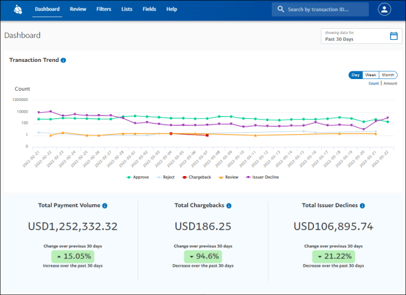 The Dashboard helps you actively monitor your acceptance, rejection, review, and chargeback rates.