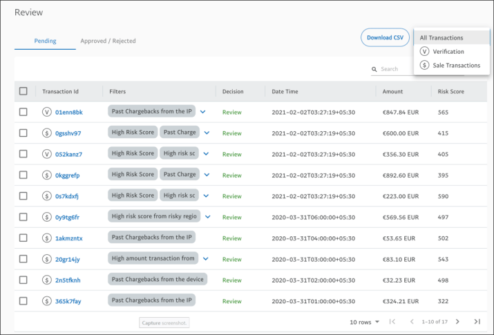 There is also an option to download cases listed on the Review page as a CSV file if required to perform any offline analysis. You can download all cases or only specific transactions.