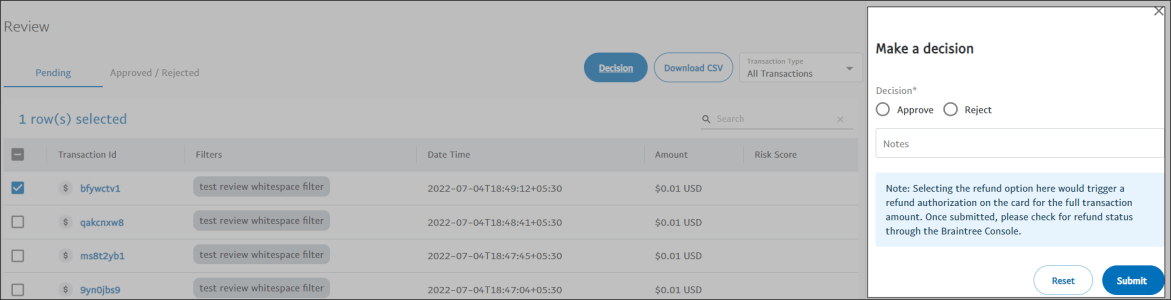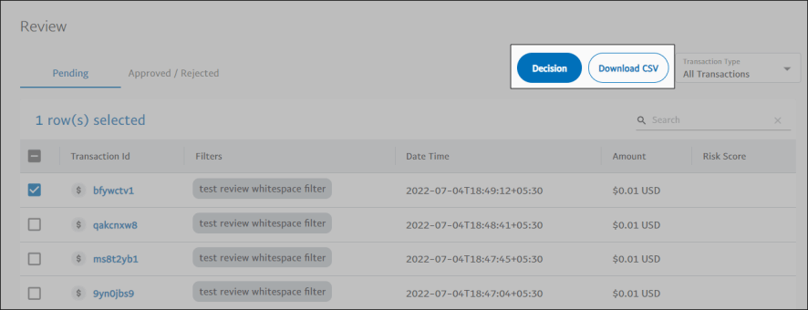 All payments tripped by the Review filters are parked on the Review page and the decision for these payments in the back end is sent as “Review” to merchants. You can consume the decision (Review) to your internal systems to be notified about the transactions that are under review. For more information on the decision consumption, see risk decision and on how to test it on Sandbox, see Fraud Tools.
