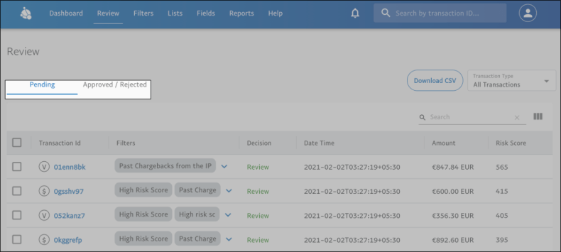 The Review page lists the payment transactions (a/k/a “cases”) that are pending for review and approved / rejected as well. You can open each case in a detailed view, which is known as Single Case View, to thoroughly review and approve or reject it based on your analysis. In your analysis, if you discover any details such as IP, Email, Address or Card-BIN hash associated with fraud or legitimate payments, you can mark them as Blocklisted or Allowlisted respectively for future use.