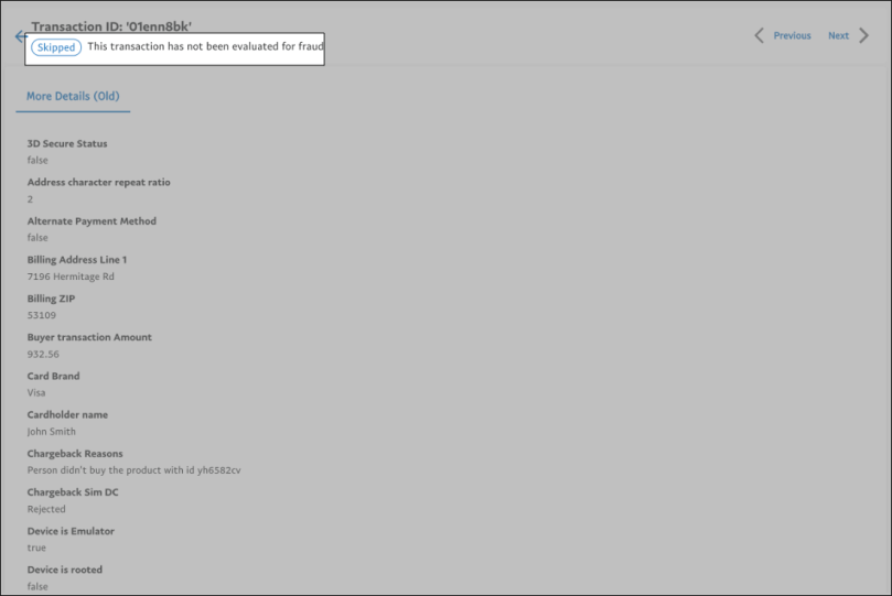 Transactions that are skipped for fraud evaluation can be searched and viewed in the FPA application through Transaction ID search. This enables you to distinguish between a skipped transaction and a fraud evaluated transaction.