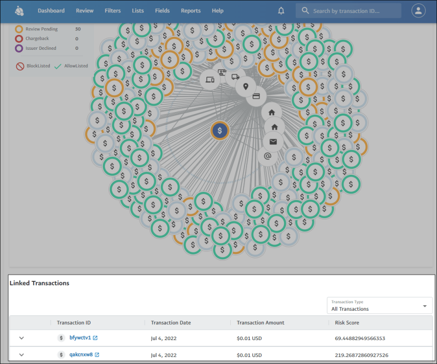 By clicking a transaction icon (including icons in the outer circle), a dialog box appears displaying the transaction details such as transaction date, amount (USD), shipping country and Zip, merchant currency code, and so on. Also, displays a hyperlink arrow—clicking it opens Single Case View of that case in a new browser tab.