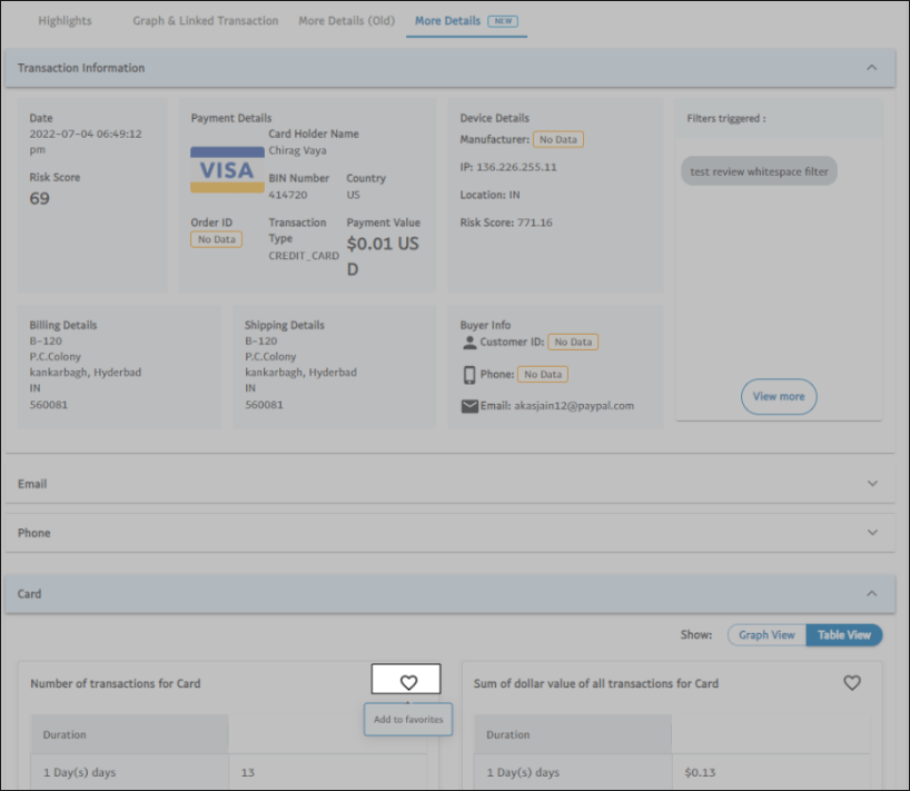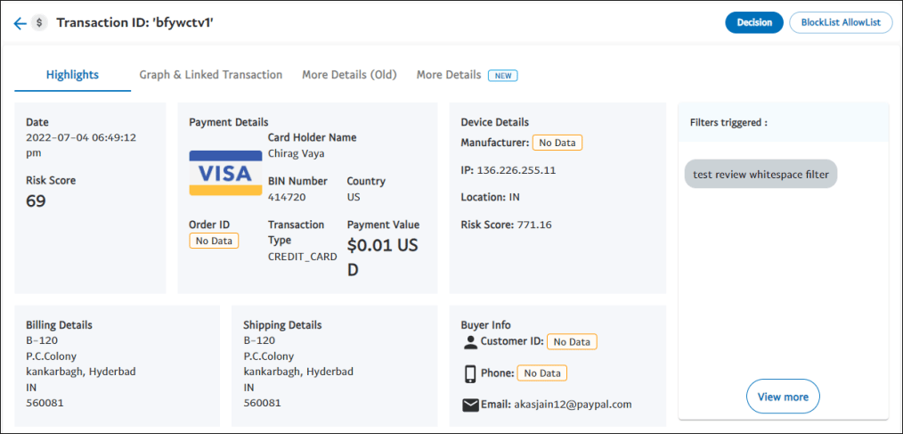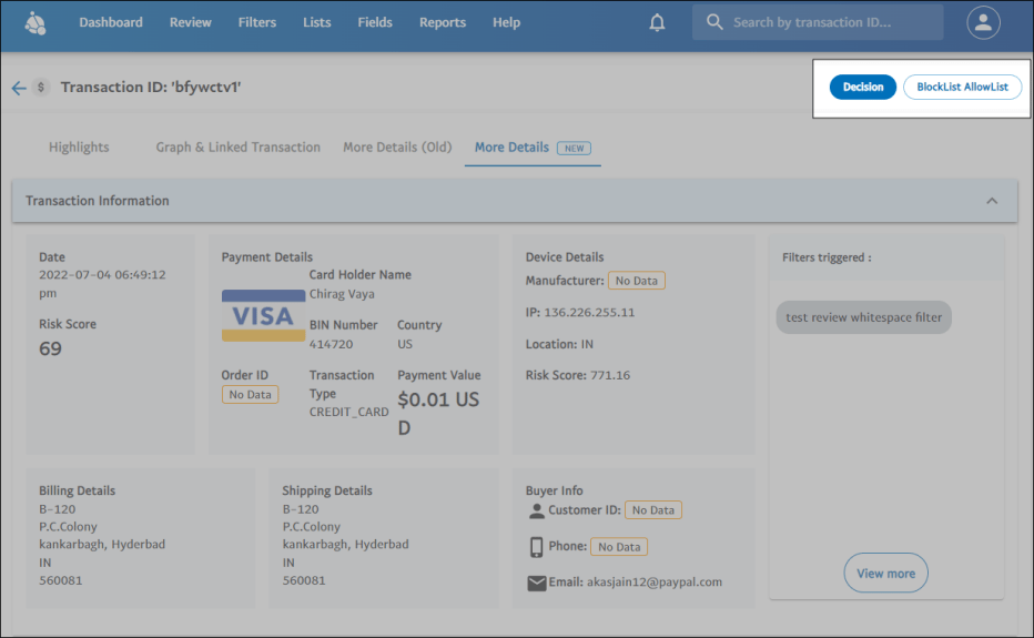 The Fraud Protection Advanced tool facilitates Single Case View that provides various details about each payment at one place, aiming to ease the manual review process. With Single Case View, you can quickly evaluate the details and make appropriate decisions. Along with the seamless review process, Single Case View also lets you add information types associated with payments to Blocklist or Allowlist, if noticed while reviewing the details.