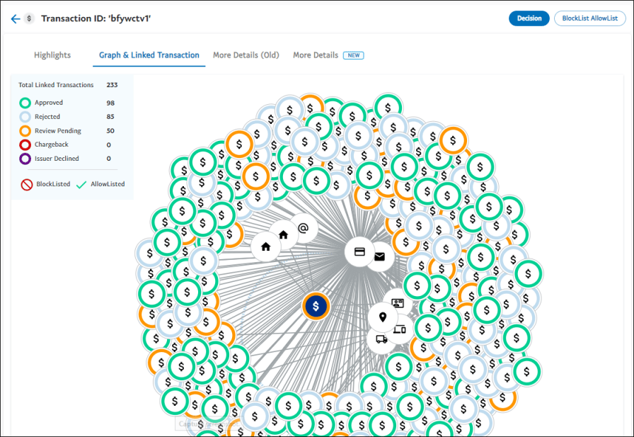 In the graph view of a case, the case is always represented with a dollar icon in the center and is surrounded by two circles. The color surrounding a dollar icon represents the state of the case. That is, approved, rejected, under review, found chargeback, or declined by an issuer.