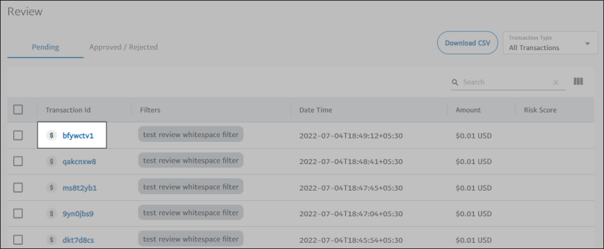 • Transaction ID displays the ID of the transactions. By clicking a transaction ID link opens Single Case View of that transaction in a new browser.